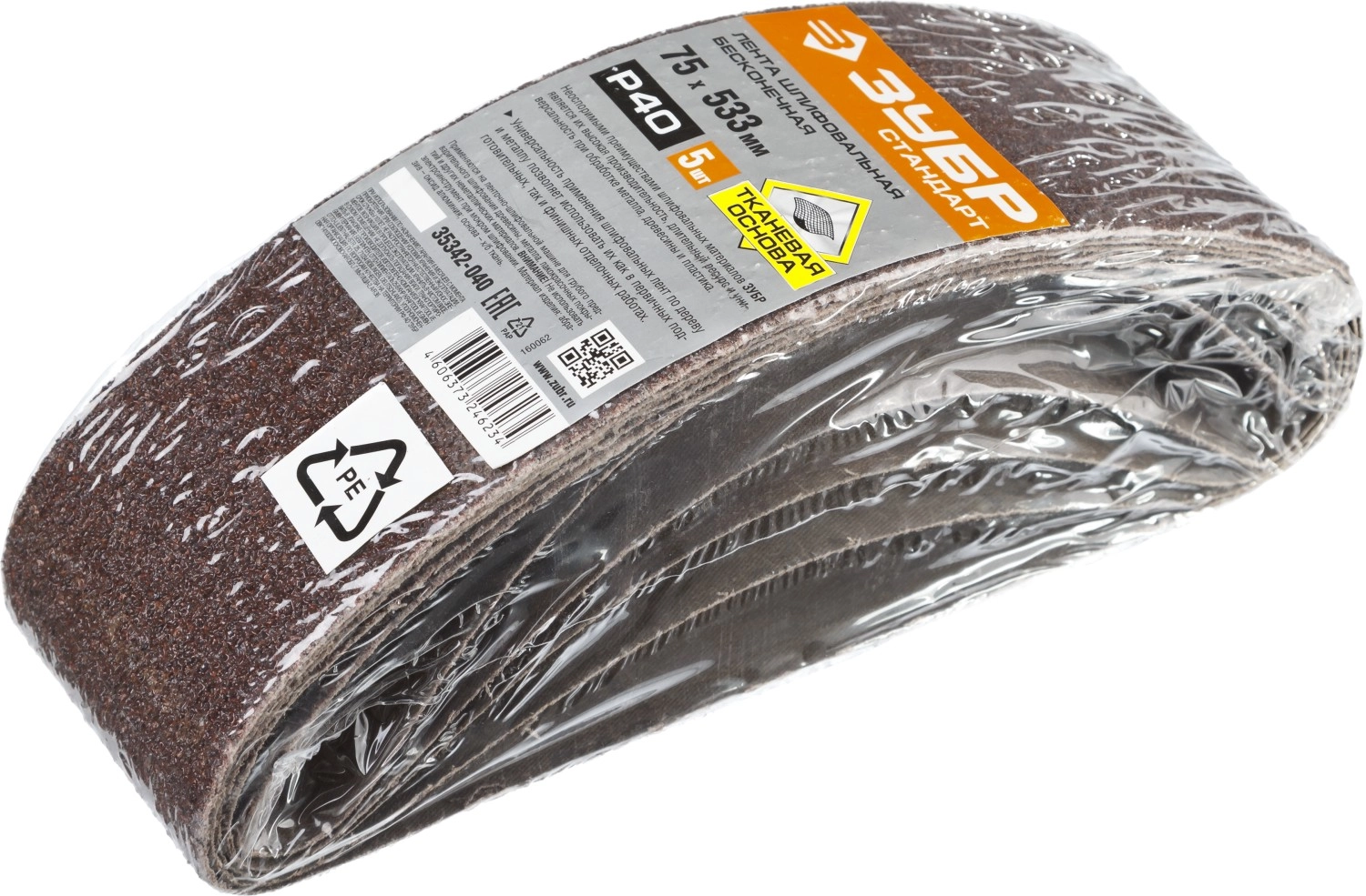 ПроизводителиЛента шлифовальная 75х533 мм, P40, велкро осн., 5 шт. (35342-040) ЗУБР