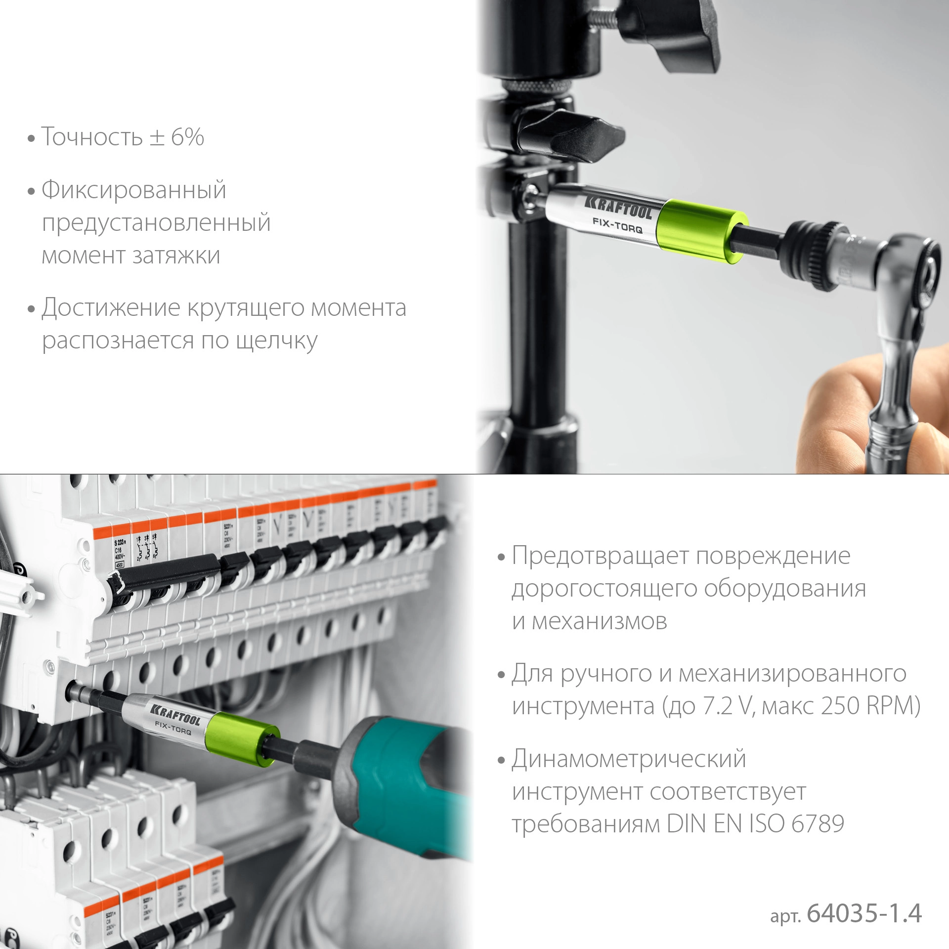 Профессиональный динамометрический инструмент с предустановленным значением крутящего момента для бит с хвостовиком 1/4″ (E 6.3). Разработан специально для ручного и механизированного инструмента (до 7.2V, макс 250 RPM).