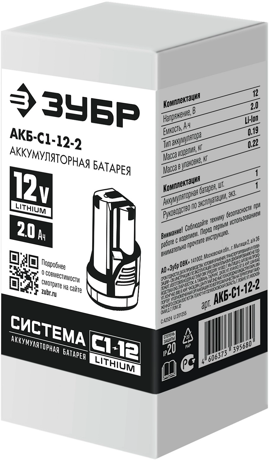 ПроизводителиАккумулятор 12В 1шт 2.0 А/ч Li-Ion, тип С1 (АКБ-С1-12-2) ЗУБР