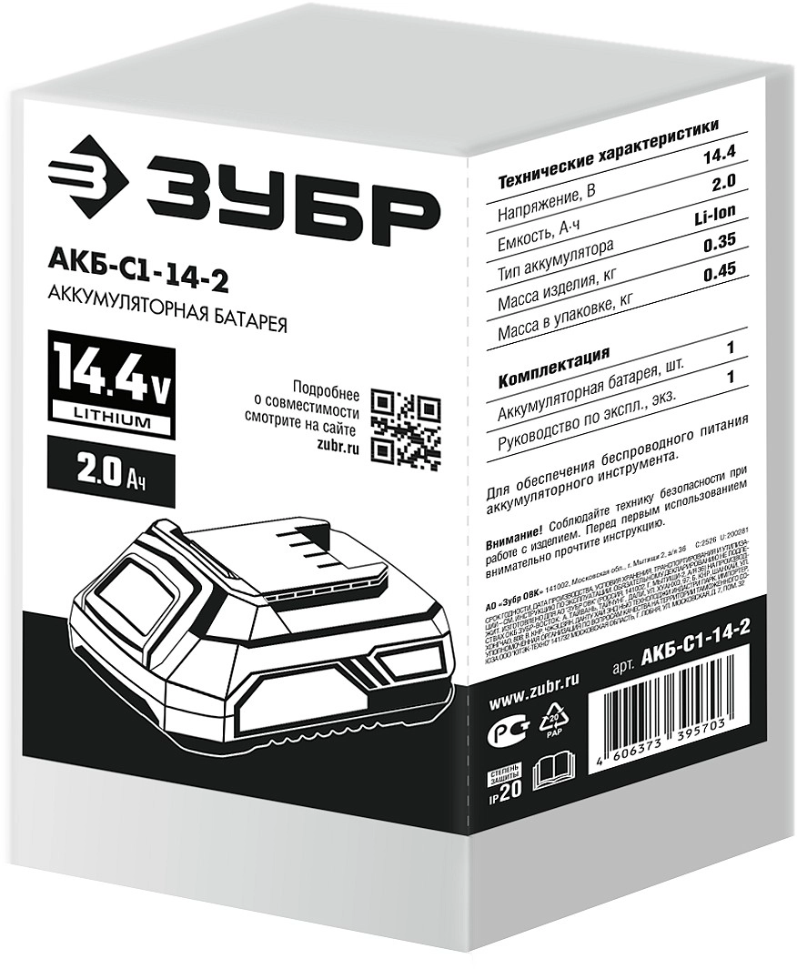 ПроизводителиАккумулятор 14.4В 1шт 2.0 А/ч Li-Ion, тип С1 (АКБ-С1-14-2) ЗУБР