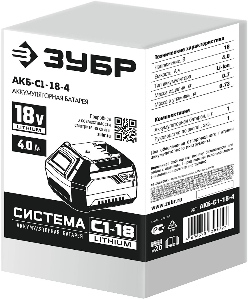 ПроизводителиАккумулятор 18В 1шт 4.0 А/ч Li-Ion, тип С1 (АКБ-С1-18-4) ЗУБР