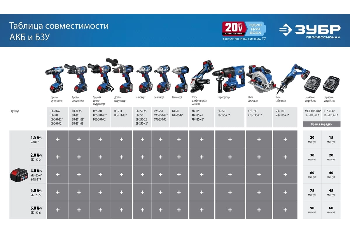 Аккумулятор 20В 1шт 4.0 А/ч Li-Ion PRO, тип Т7 "ПРОФЕССИОНАЛ" (ST7-20-4) ЗУБР147.05 руб.Зарядное устройство 16-20В 1шт 6.0 А/ч Li-Ion PRO, тип Т7 "ПРОФЕССИОНАЛ" (RT7-20-6) ЗУБРАртикул: RT7-20-6140.54 руб. за штУгловая шлифмашина аккум. AB-125 (20.0 В, без АКБ и ЗУ, 125мм, кор.) "Профессионал" ЗУБРАртикул: AB-125330.23 руб. за штПила циркулярная аккум. CPB-190 (20.0 В, без АКБ и ЗУ, диск 190x20 мм, кор.) "Профессионал" ЗУБРАртикул: CPB-190361.67 руб. за штЭкономия 979.49 руб.Аккумуляторы для электроинструмента 0Угловые шлифмашины 0Пилы циркулярные 0Похожие товарыКод товара: 008208724.97 руб. за штКод товара: 0082084195.58 руб. за штКод товара: 0073433434.40 руб. Скидка 6% 408.34 руб. за штКод товара: 0080567114.78 руб. Скидка 2% 112.02 руб. за шт - Оснастка к электроинструментам
