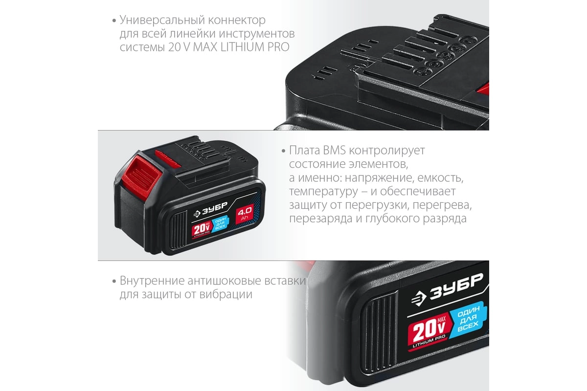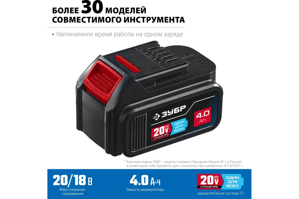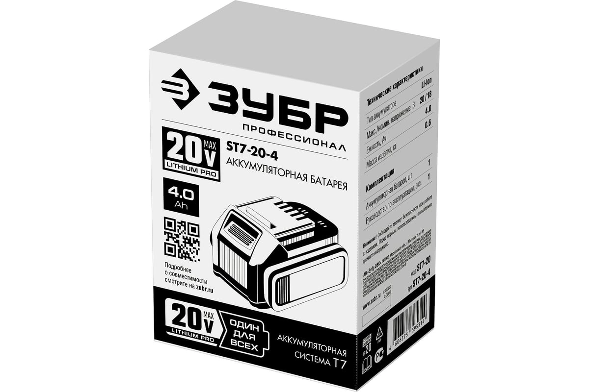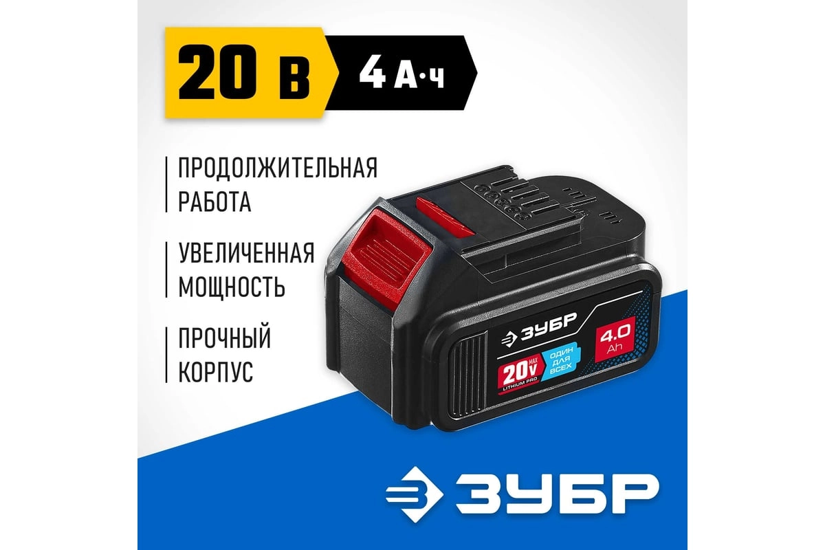 ХарактеристикиАртикул ST7-20-4Бренды ЗубрСтрана производства КитайАккумуляторная система ЗУБР Li-Ion PRO 20BТип Li-IonНапряжение аккумулятора 20Назначение для строительного инструментаЦвет черныйЕмкость аккумулятора 4Напряжение 20Вес 0.65Устройство аккумулятора слайдерИндикатор уровня заряда НетМатериал пластикШирина в упаковке 7Высота в упаковке 12Глубина в упаковке 8.5Описание товара обновлено 08.12.2025 14:38:42Аккумуляторная батарея Зубр ST7-20-4, предназначена для питания аккумуляторного инструмента: DL-20 A5, DB-20 A5, DL-201, DB-201, DB-211, DBS-201, GB-250, GVB-250, GB-500, AB-125
