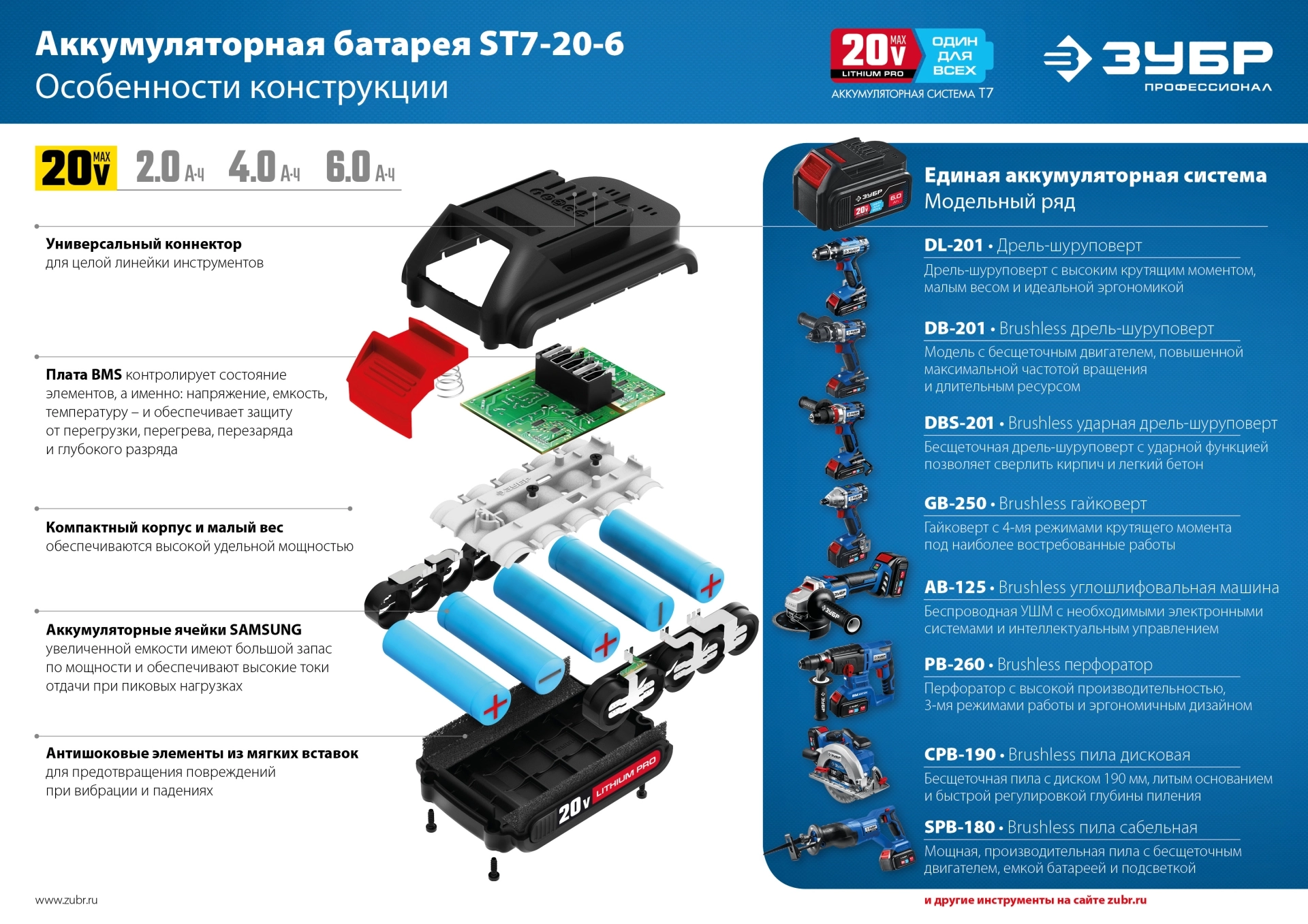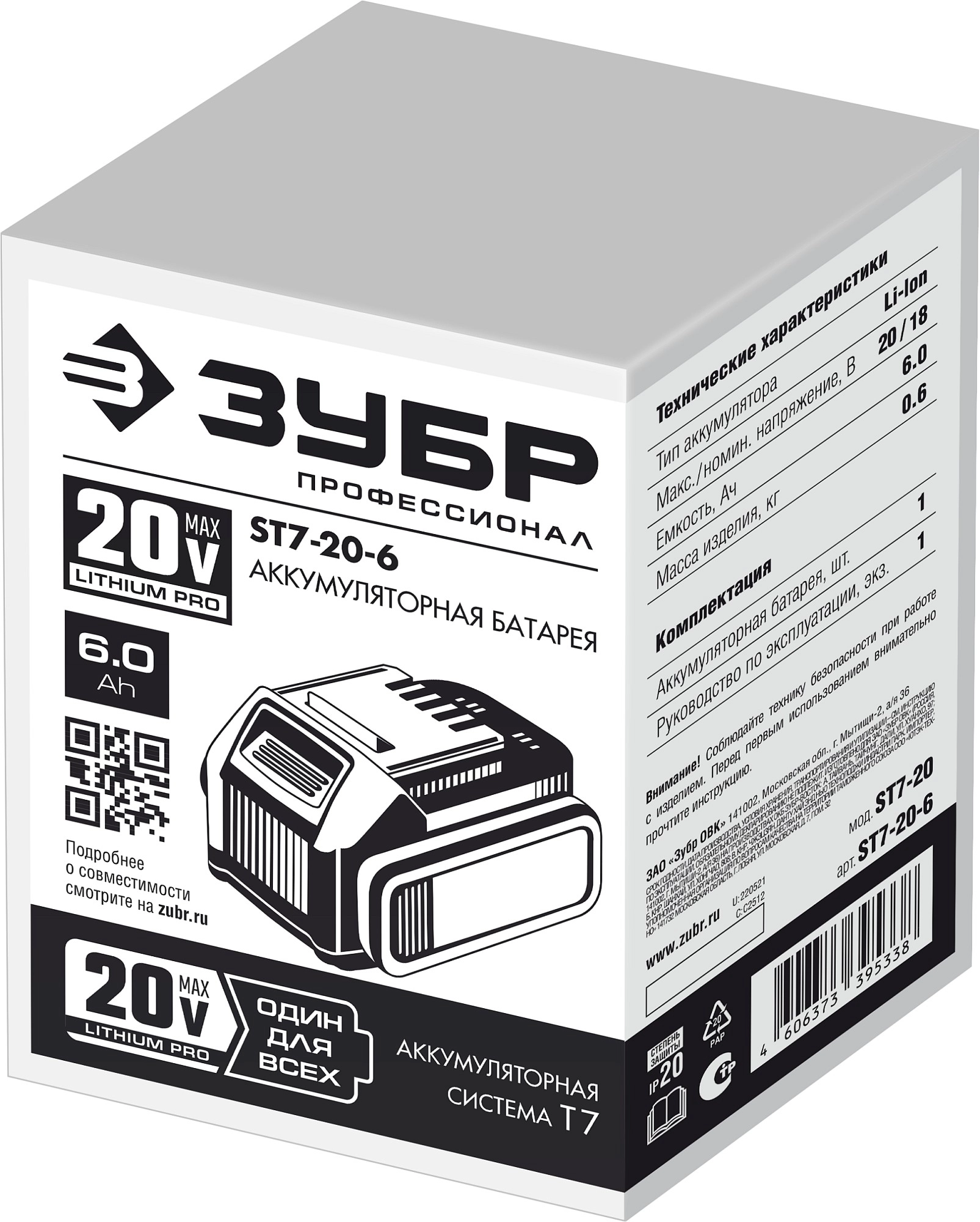 ПроизводителиАккумулятор 20В 1шт 6.0 А/ч Li-Ion PRO, тип Т7 "ПРОФЕССИОНАЛ" (ST7-20-6) ЗУБР