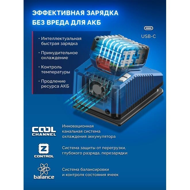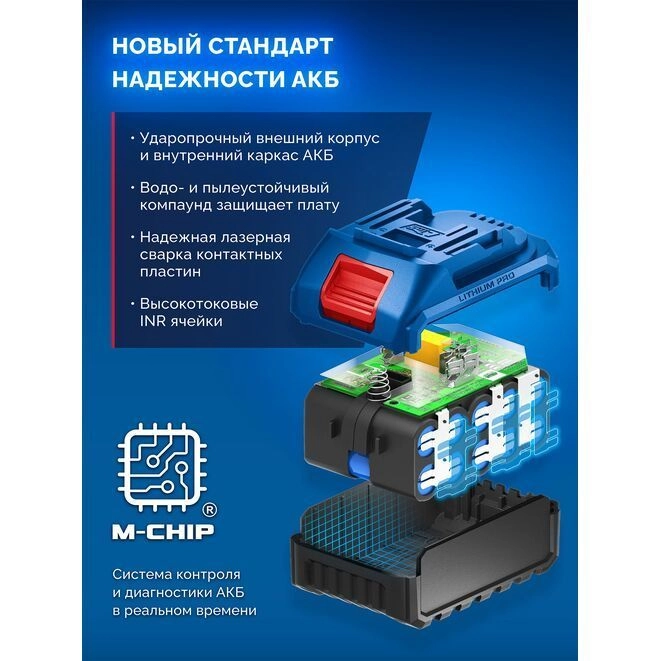 - Система М-CHIP через специальный разъем постоянно контролирует состояние каждой ячейки аккумулятора при эксплуатации, зарядке и хранении для гарантированной защиты от: