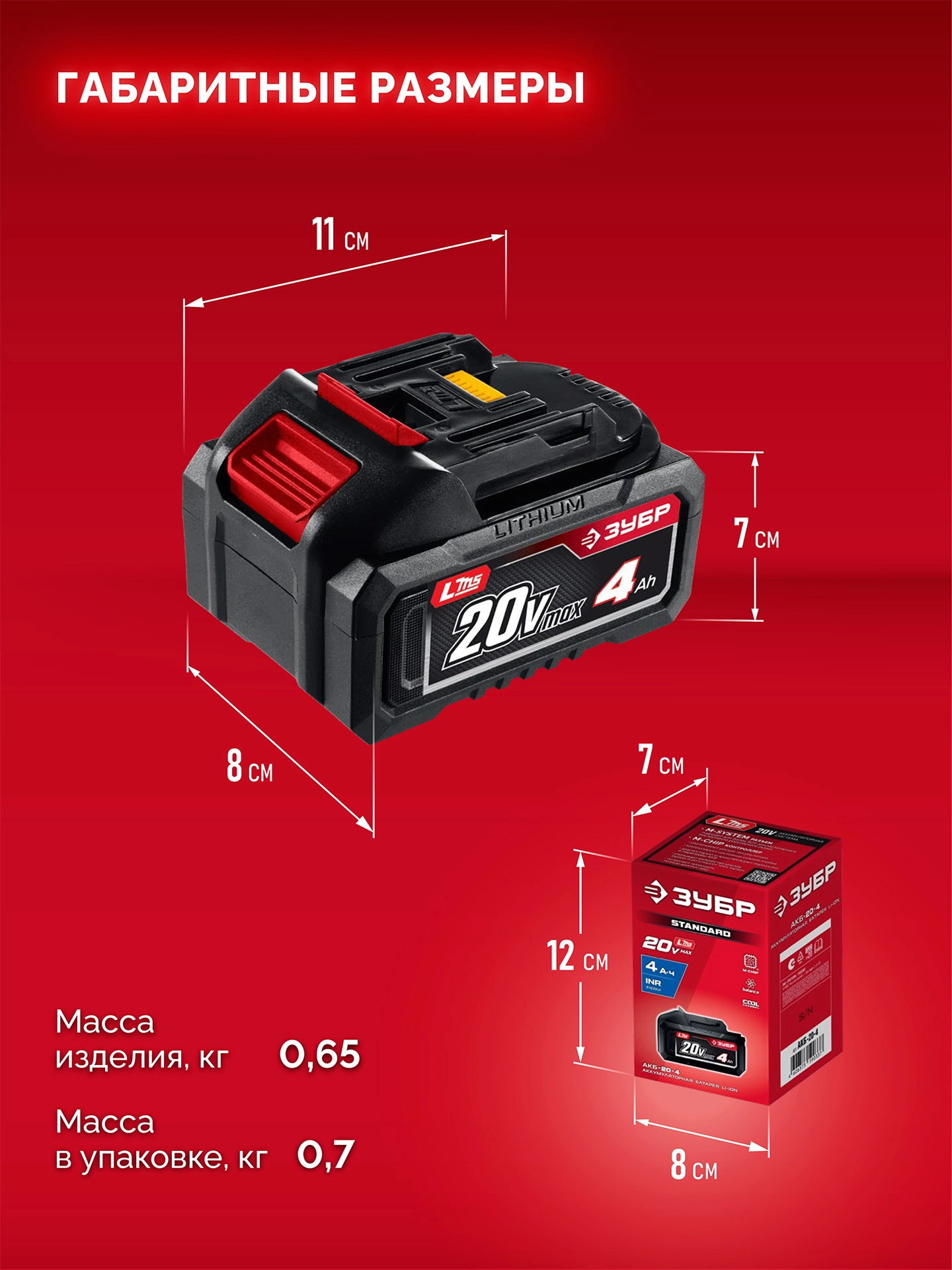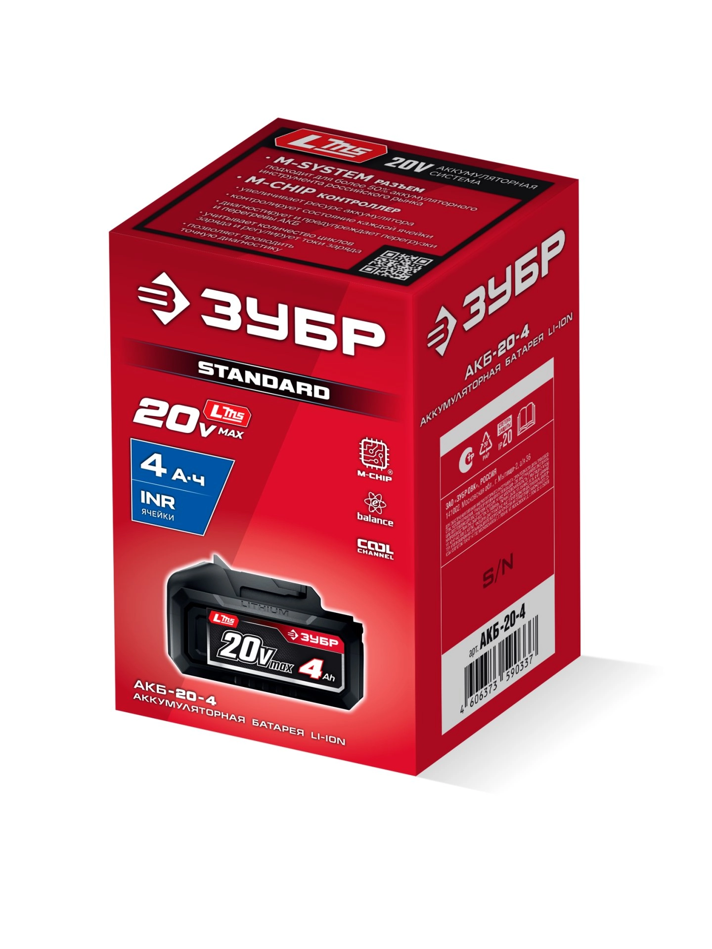ПроизводителиАккумулятор (LMS) 20 В, 1шт., 4.0 А/ч Li-Ion (АКБ-20-4) ЗУБР