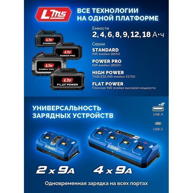 Источник питания для инструмента ЗУБР Професссионал системы LMS позволит Вам работать дольше и производительнее. Качественные элементы INR-18650 с усовершенствованной технологией обеспечивают повышенные удельные характеристики и длительный срок службы.Применение