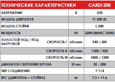 ПроизводителиУстановка алмазного сверления Cardi 200 (2,2кВт, 220В,1800 об/мин, 3 скор.вр., до 202мм)