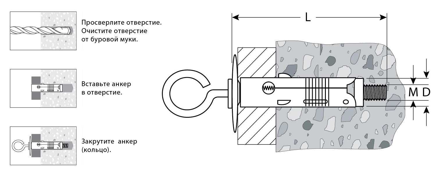 Анкер устанавливается в предварительно просверленное отверстие, расклинивание происходит при вкручивании кольца с резьбовым стержнем.