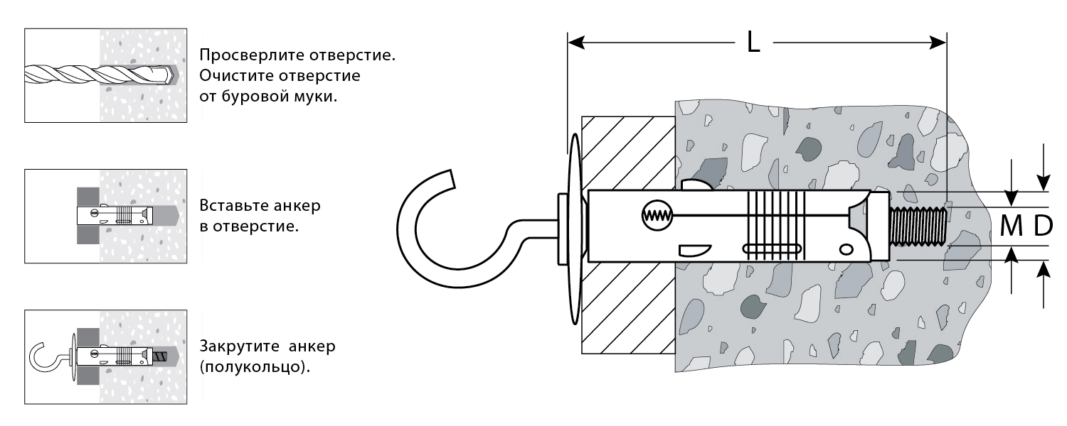 Анкер устанавливается в предварительно просверленное отверстие, расклинивание происходит при вкручивании полукольца с резьбовым стержнем;