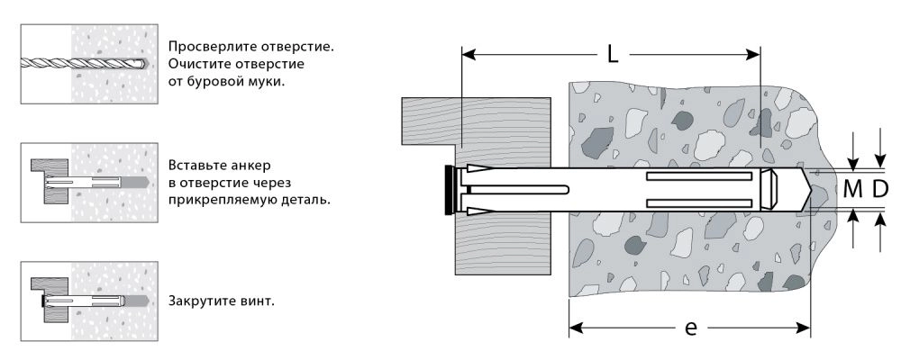 Анкер устанавливается в предварительно просверленное отверстие, расклинивание происходит при вкручивании винта. Анкер расклинивается не только в основании, но и около головки винта, плотно прижимая прикрепляемый материал к основанию; Ребра на гильзе предотвращают проворачивание анкера в отверстии;