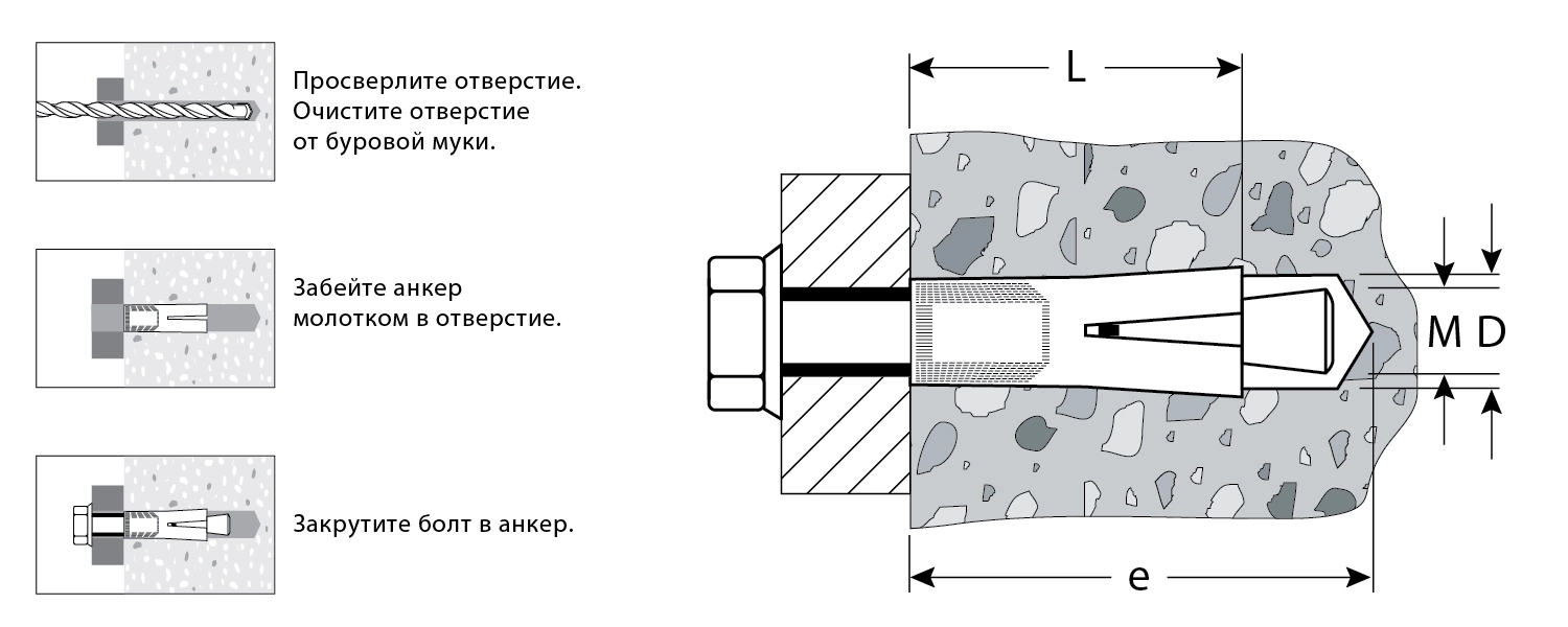 Фиксация анкера в основании достигается путем вкручивания болта. При этом происходит расклинивание, и анкер удерживается в основании за счет сил трения.