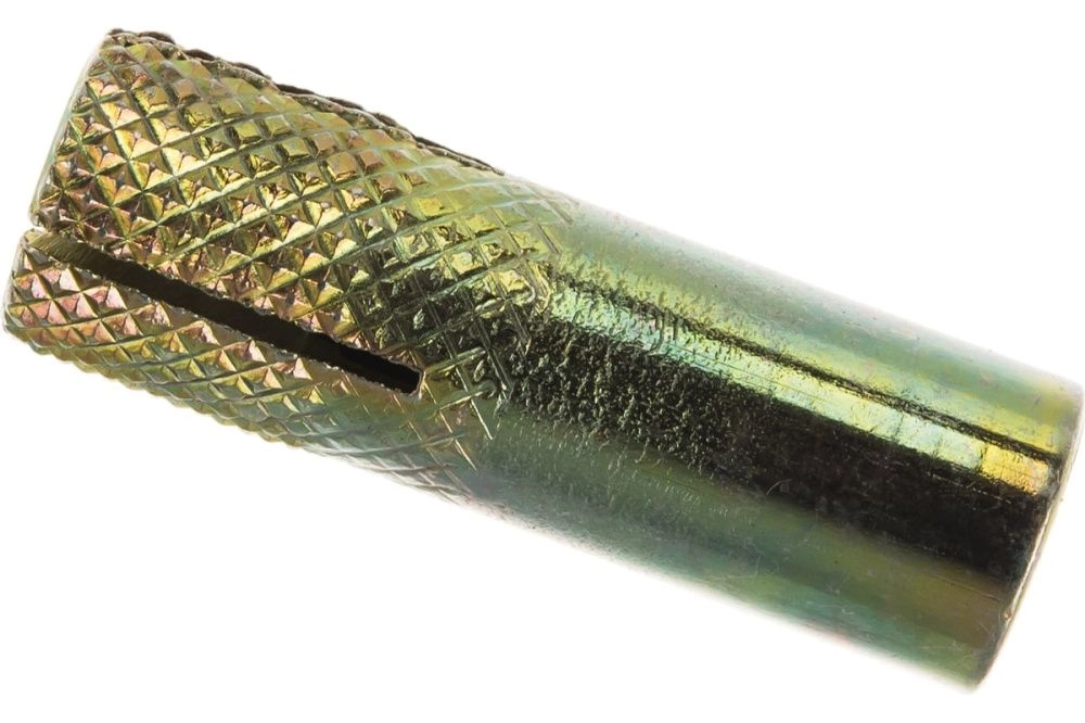 Анкер забивной Хортъ 26671-0 необходим для надежного крепления различных тяжелых конструкций к бетонному или кирпичному основанию. Приспособление выполнено в виде цилиндра с конусообразным клином внутри, оснащенное внутренней метрической резьбой М8. Крепеж изготовлен из оцинкованной стали с желтым электролитическим покрытием. Для установки анкера нужно предварительно просверлить отверстие, соответствующее его размеру.