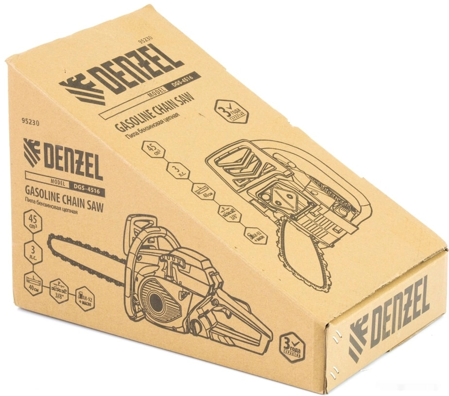 ПроизводителиБензопила DGS-4516, шина 40 см, 45см3, 3,0 л.с., шаг 3/8, паз 1,3 мм, 57 зв Denzel
