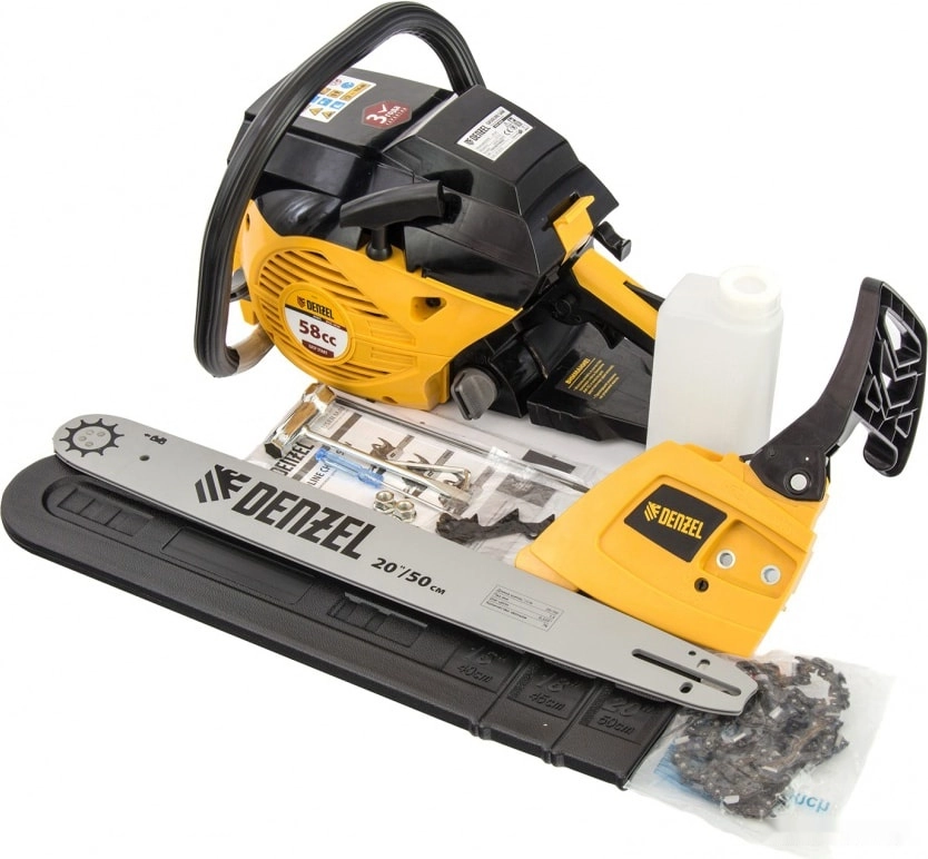 ПроизводителиБензопила DGS-5820, шина 50 см, 58см3, 4,1 л.с., шаг 0,325, паз 1,5 мм, 76 зв Denzel