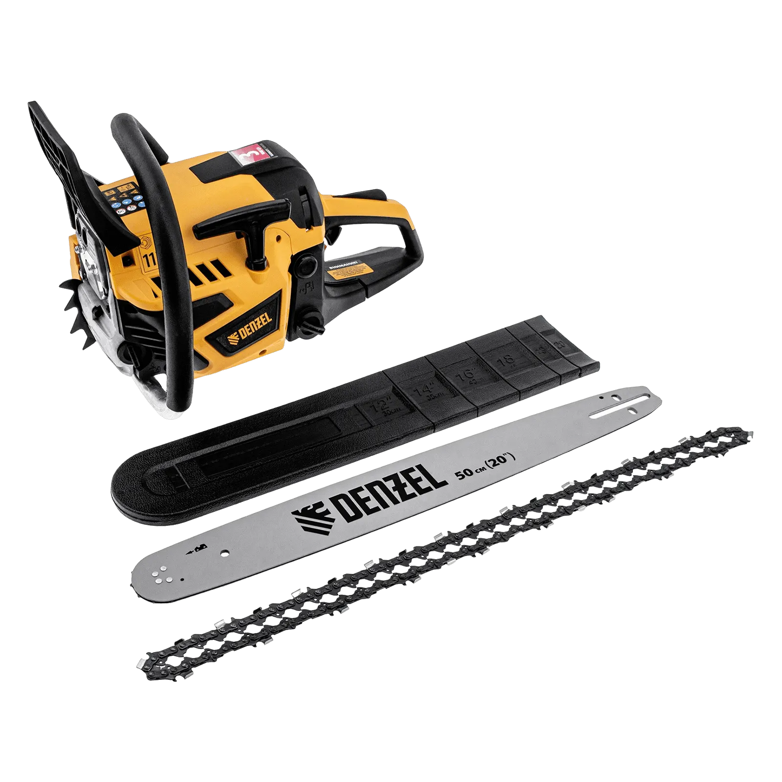 Комплектация: Пила цепная бензиновая - 1 шт, Шина - 1 шт, Чехол шины - 1 шт, Цепь - 1 шт, Емкость для приготовления смеси - 1 шт, Комплект инструментов - 1 шт, Свечной ключ - 1 шт, Руководство по эксплуатации и гарантийный талон - 1 шт,Пила цепная бензиновая - 1 шт