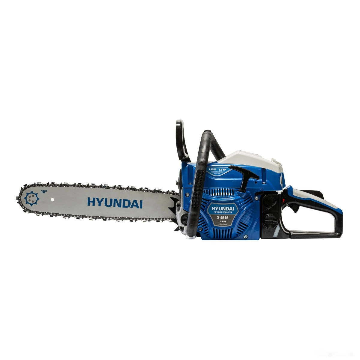ПроизводителиБензопила HYUNDAI X-4516 (2.4 кВт/3.3 л.с, шина 40см, 0.058"/1.5мм, 66 звеньев, 11000 об/мин)