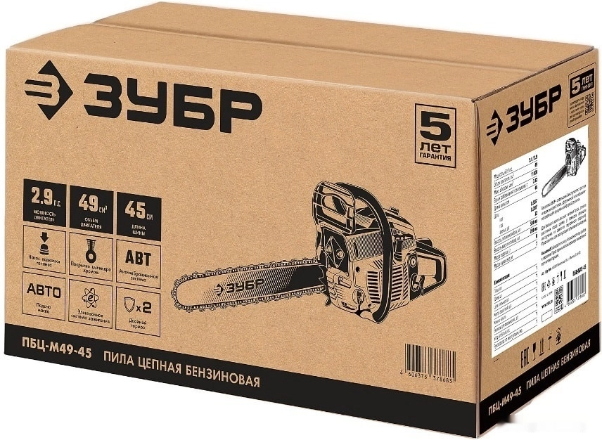 ХарактеристикиАртикул ПБЦ-М49-45Бренды ЗубрСтрана производства КитайТип бензиноваяДлина цепи 45Мощность, л.с. 2.9Объём двигателя 49Количество звеньев цепи 72Вес 5.8Длина шины 45Емкость топливного бака 0.55Емкость масляного бака 0.26Антивибрация естьБыстрое натяжение цепи нетПодогрев рукояток нетОписание товара обновлено 08.12.2025 14:41:14Пила цепная бензиновая ЗУБР ПБЦ-М49-45, предназначена для пиления досок, бруса, стволов различных пород дерева на дачном участке. В отличие от электрической, бензиновая пила оснащена более мощным двигателем, безопасна в отношении поражения электрическим током, может работать в любую погоду и в любом месте. Повышенная мощность при компактных размерах. Насос подкачки топлива способствует более легкому запуску, даже в холодную погоду. Продуманная виброгасительная система, очень эффективна при длительном пилении. Электронная система зажигания обеспечивает ровную, экономичную и экологичную работу двигателя. Насос принудительной подачи смазки к цепи уменьшает износ, что увеличивает срок службы цепи и шины. Тормоз мгновенного действия обеспечивает высокую безопасность работ, мгновенно останавливая пильную цепь в случае опасности. Система предварительной очистки воздуха удаляет из входного воздуха наиболее крупные частицы и увеличивает срок службы фильтра. Удобная эргономичная рукоятка.Производитель: Крафтул И/Е Гмбх, Альтер Поствег Штр., Лоенинген, Германия