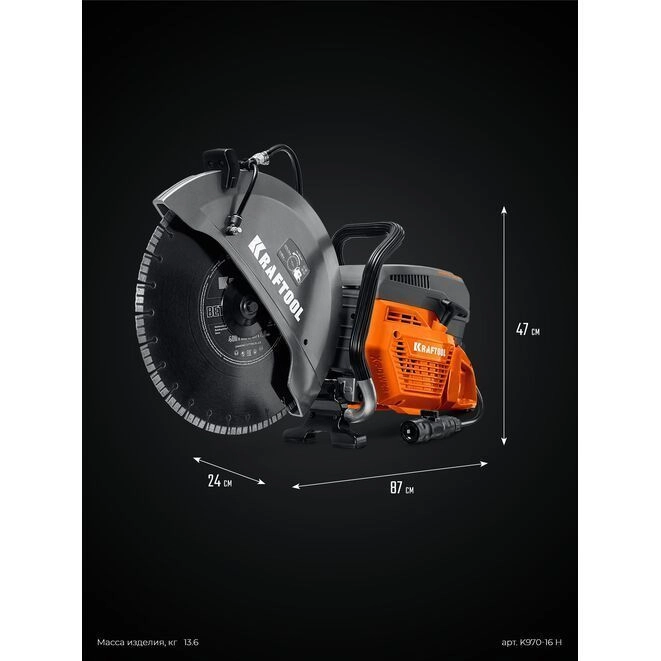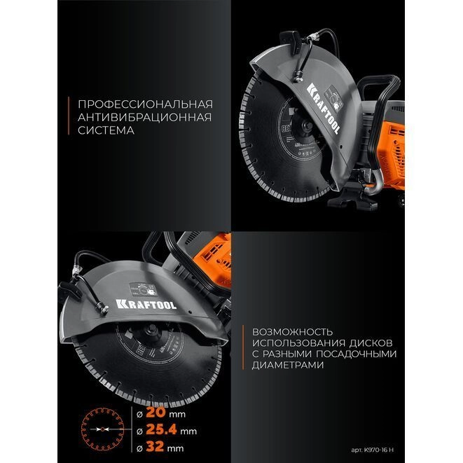ПроизводителиБензорез K970-16 H (4.8 кВт, круг 400х32/25.4/20мм, 145 мм, по бетону, с подачей воды) KRAFTOOL