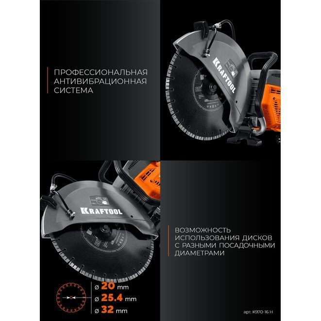 ПроизводителиБензорез K970-16 H (4.8 кВт, круг 400х32/25.4/20мм, 145 мм, по бетону, с подачей воды) KRAFTOOL