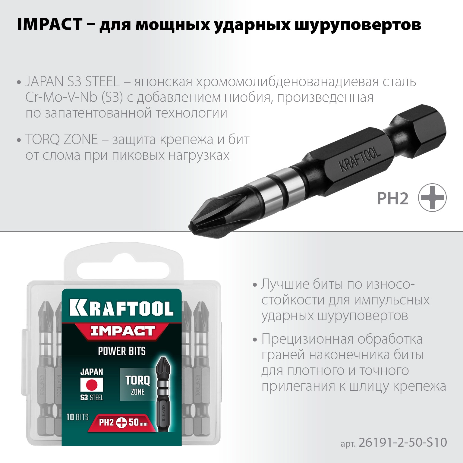 ПроизводителиБита PH2 L= 50 мм, ударная, 1/4", 10 шт. "Impact Pro" (26191-2-50-S10) KRAFTOOL
