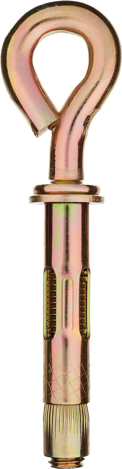 Анкер устанавливается в предварительно просверленное отверстие, расклинивание происходит при закручивании резьбового стержня с кольцом;