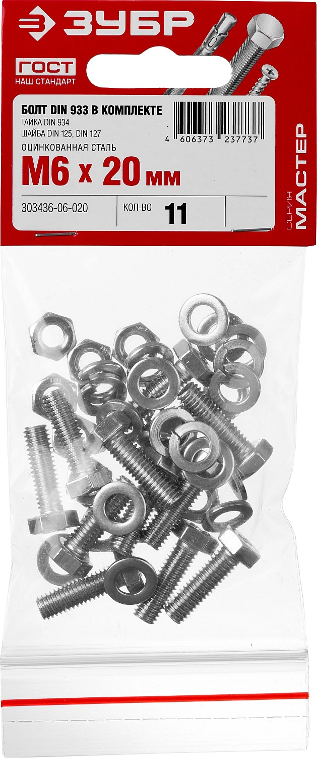 ПроизводителиКомплект (болт, гайка, шайба, гровер) DIN933,934,125,127 оцинк. M6x20мм, 11шт. (303436-06-020) ЗУБР