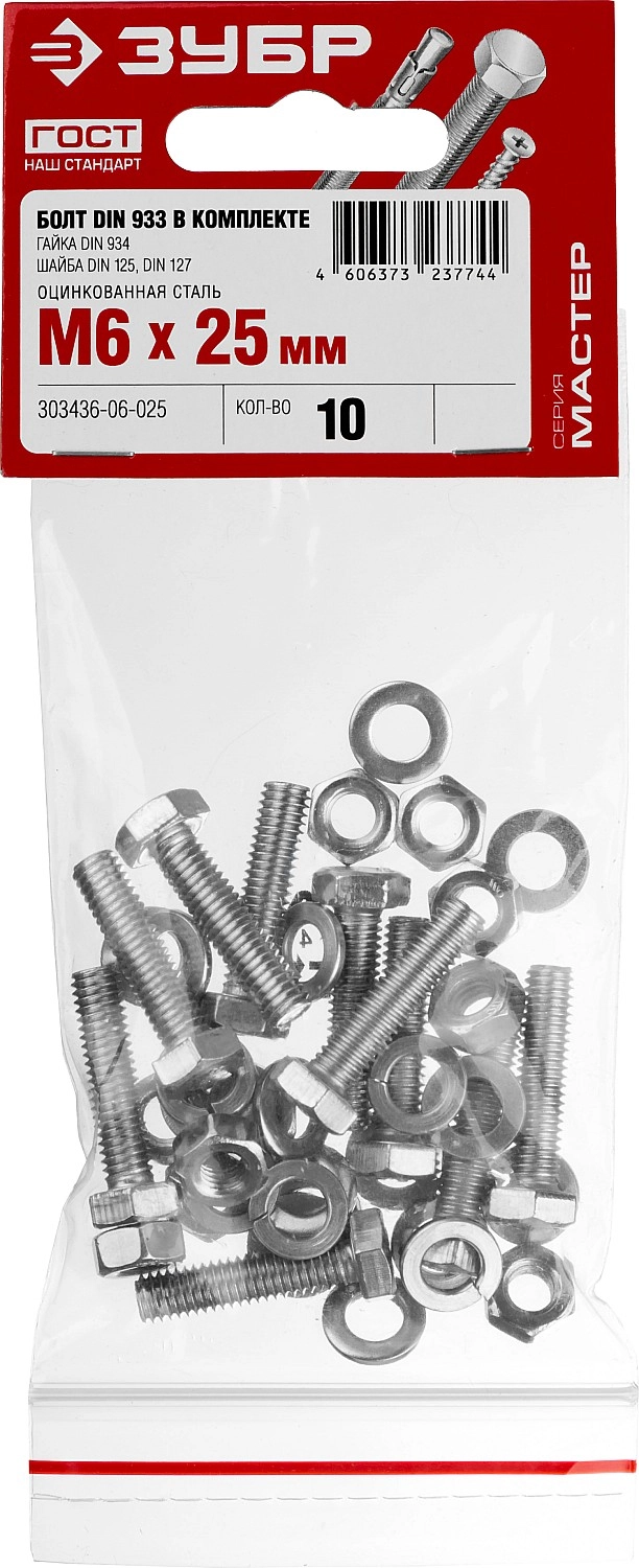 ПроизводителиКомплект (болт, гайка, шайба, гровер) DIN933,934,125,127 оцинк. M6x25мм, 10шт. (303436-06-025) ЗУБР