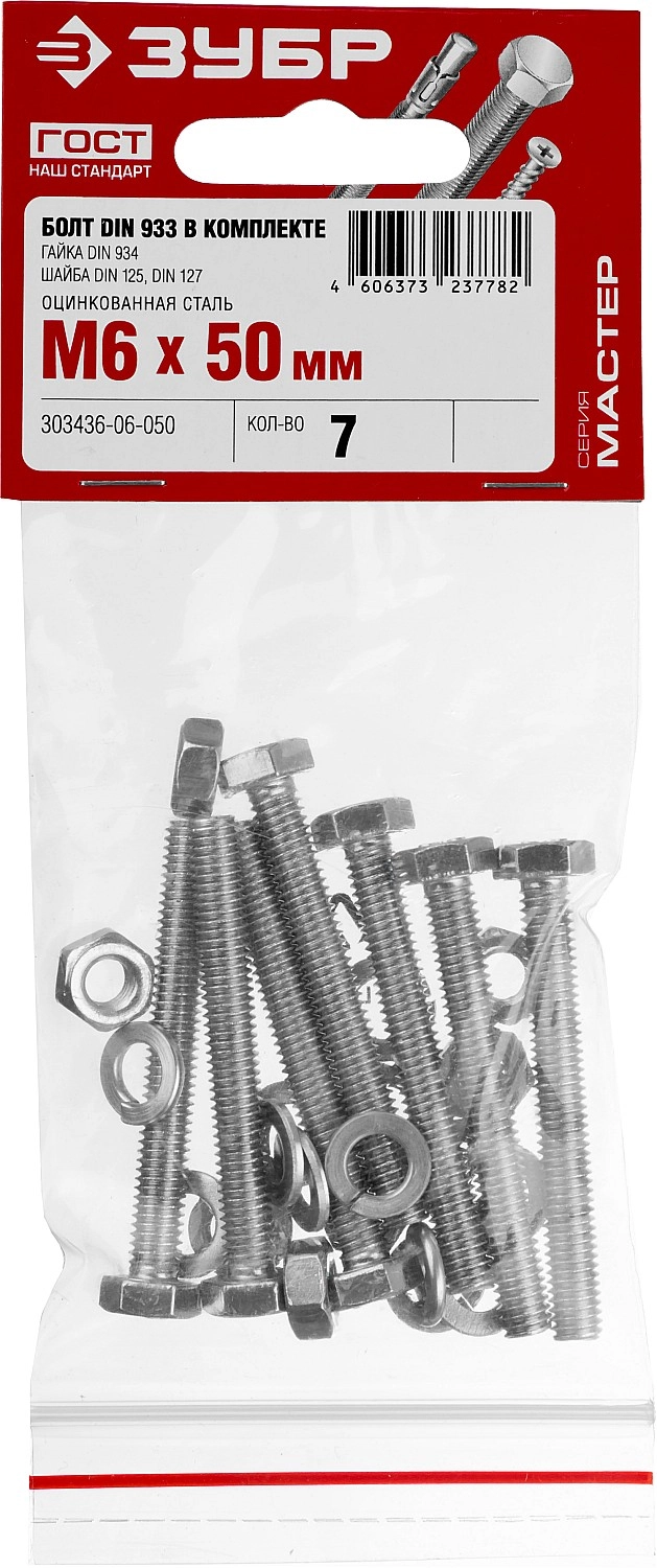 ПроизводителиКомплект (болт, гайка, шайба, гровер) DIN933,934,125,127 оцинк. M6x50мм, 7шт. (303436-06-050) ЗУБР