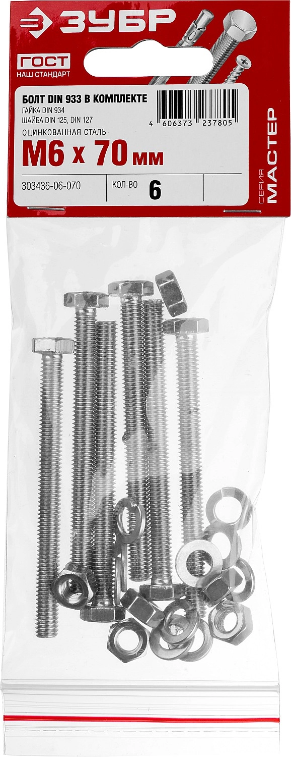 ПроизводителиКомплект (болт, гайка, шайба, гровер) DIN933,934,125,127 оцинк. M6x70мм, 6шт. (303436-06-070) ЗУБР