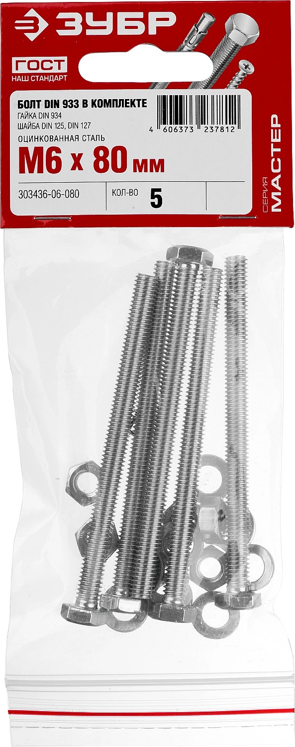 ПроизводителиКомплект (болт, гайка, шайба, гровер) DIN933,934,125,127 оцинк. M6x80мм, 5шт. (303436-06-080) ЗУБР