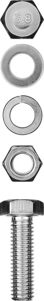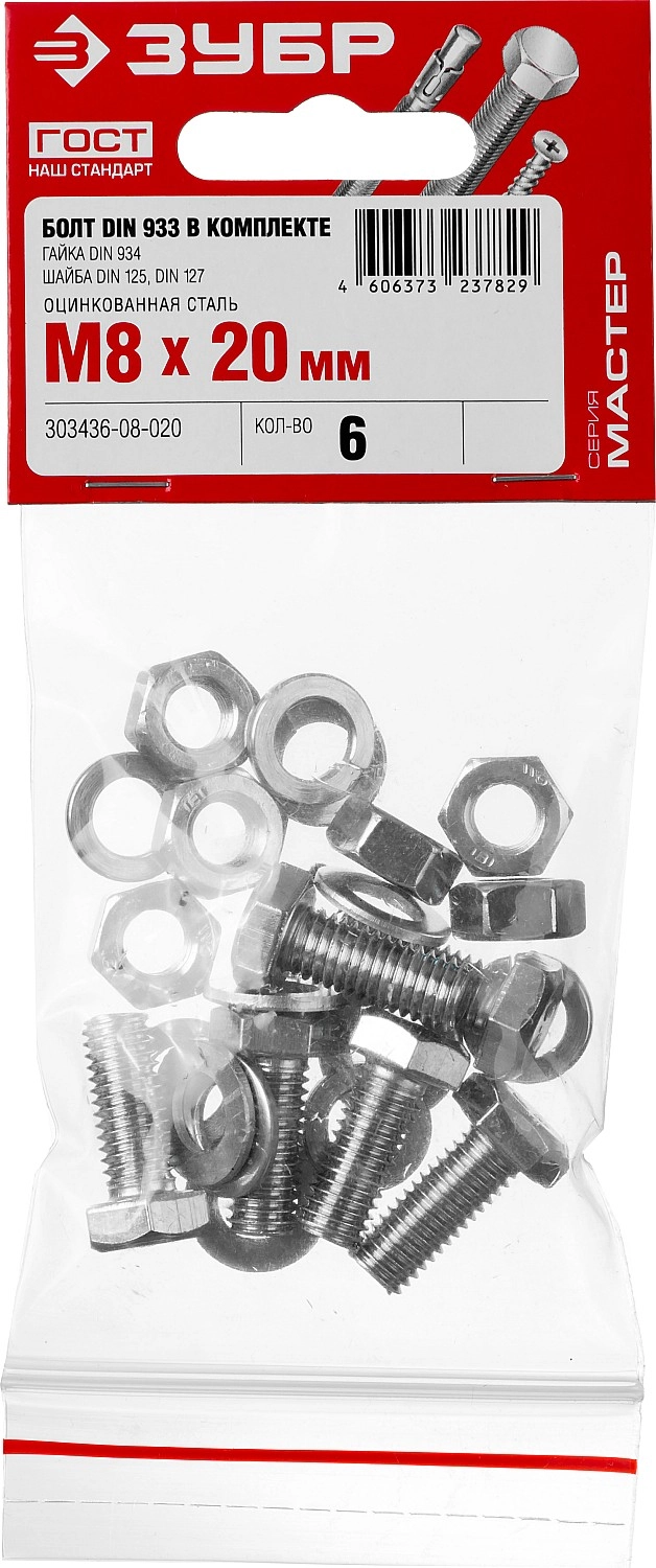 ПроизводителиКомплект (болт, гайка, шайба, гровер) DIN933,934,125,127 оцинк. M8x20мм, 6шт. (303436-08-020) ЗУБР