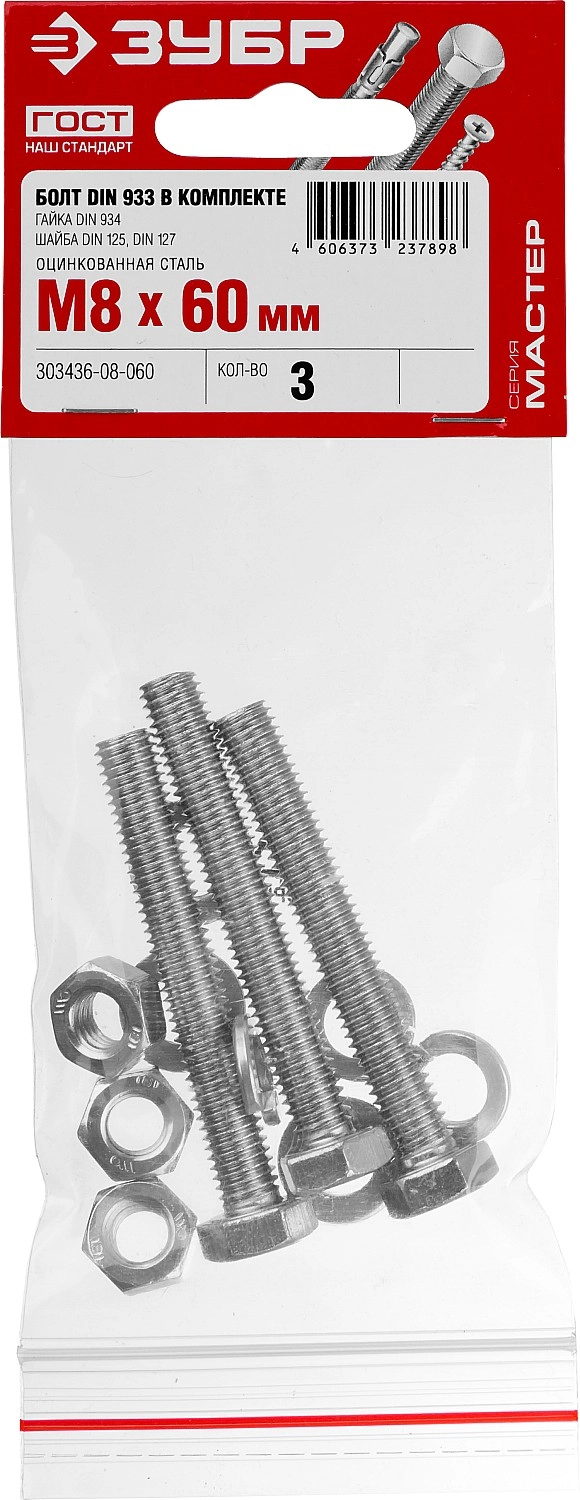ПроизводителиКомплект (болт, гайка, шайба, гровер) DIN933,934,125,127 оцинк. M8x60мм, 3шт. (303436-08-060) ЗУБР
