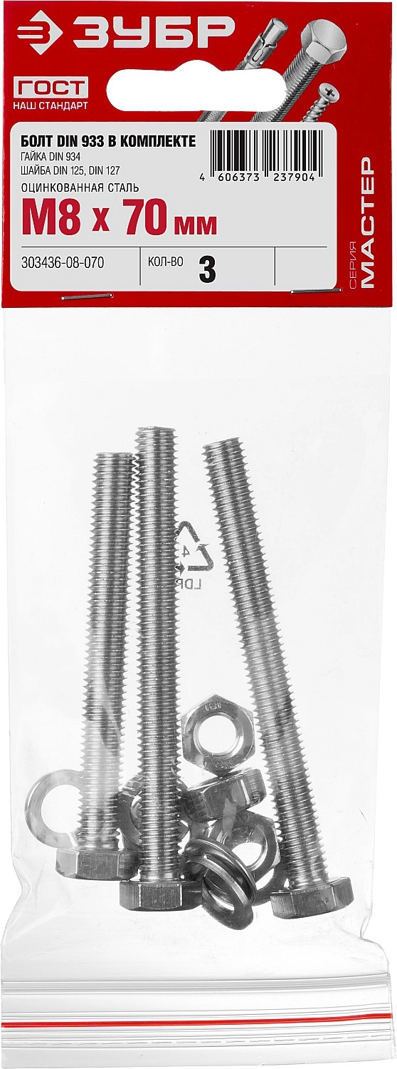 ПроизводителиКомплект (болт, гайка, шайба, гровер) DIN933,934,125,127 оцинк. M8x70мм, 3шт. (303436-08-070) ЗУБР