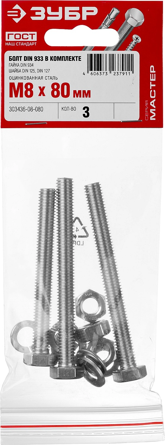 ПроизводителиКомплект (болт, гайка, шайба, гровер) DIN933,934,125,127 оцинк. M8x80мм, 3шт. (303436-08-080) ЗУБР