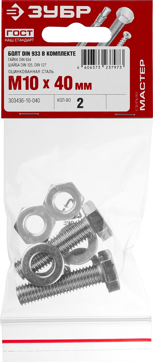 ПроизводителиКомплект (болт, гайка, шайба, гровер) DIN933,934,125,127 оцинк. M10x40мм, 2шт. (303436-10-040) ЗУБР