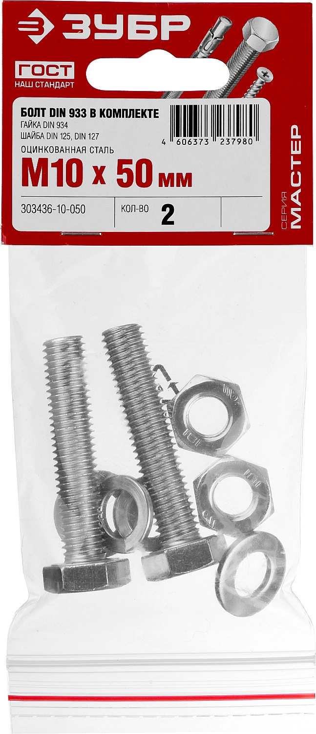 ПроизводителиКомплект (болт, гайка, шайба, гровер) DIN933,934,125,127 оцинк. M10x50мм, 2шт. (303436-10-050) ЗУБР