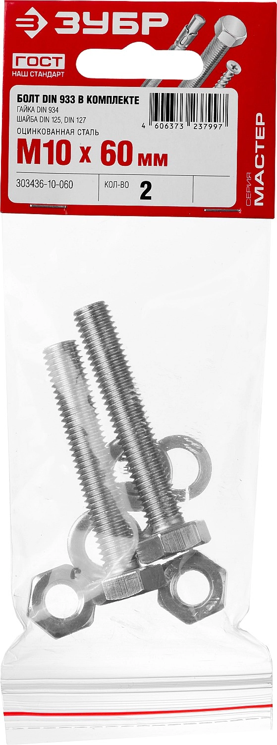 ПроизводителиКомплект (болт, гайка, шайба, гровер) DIN933,934,125,127 оцинк. M10x60мм, 2шт. (303436-10-060) ЗУБР