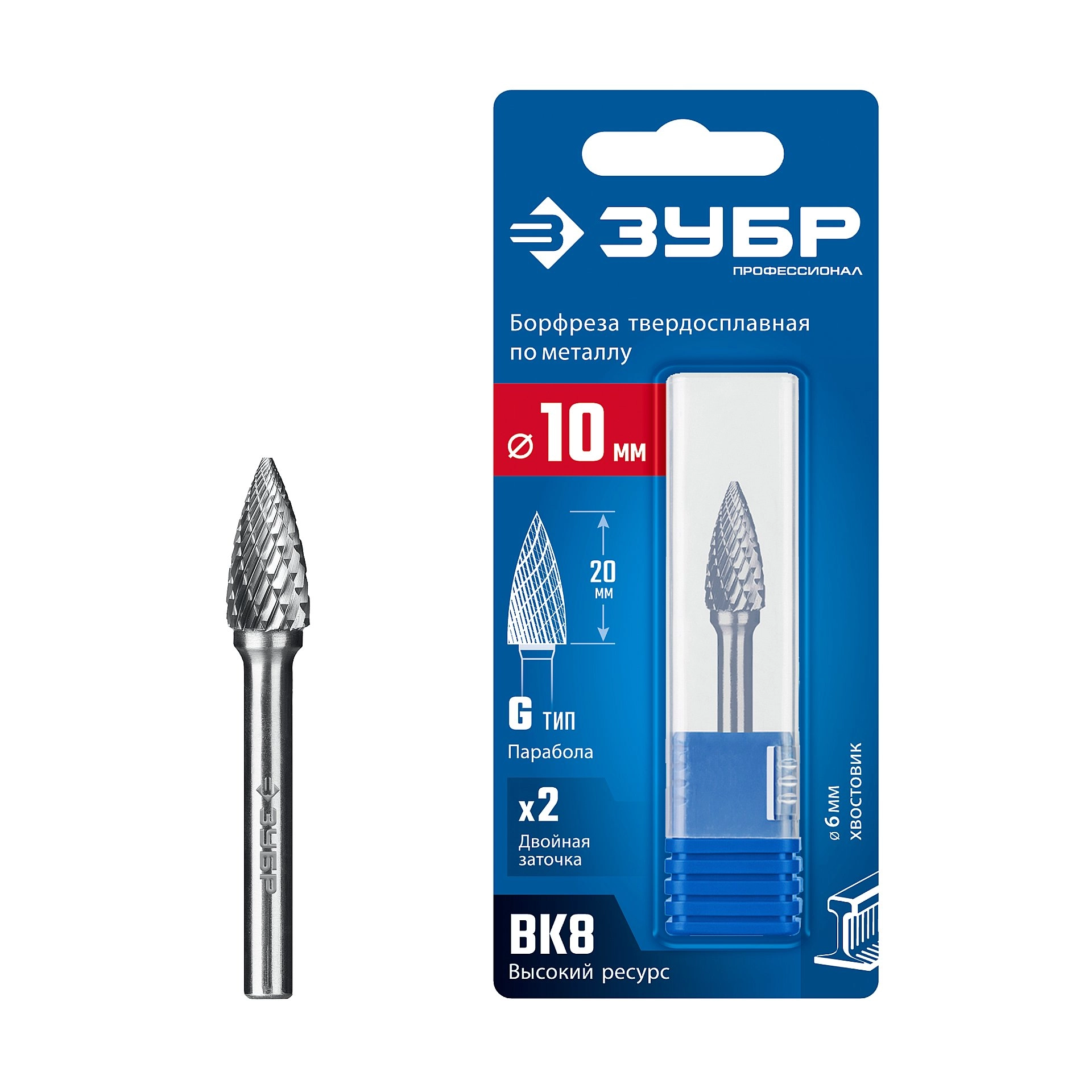 ПроизводителиБорфреза параболическая 10х20х65 мм, тип G, остр. угол, хв-к 6 мм "ПРОФЕССИОНАЛ" (28806-10-20) ЗУБР