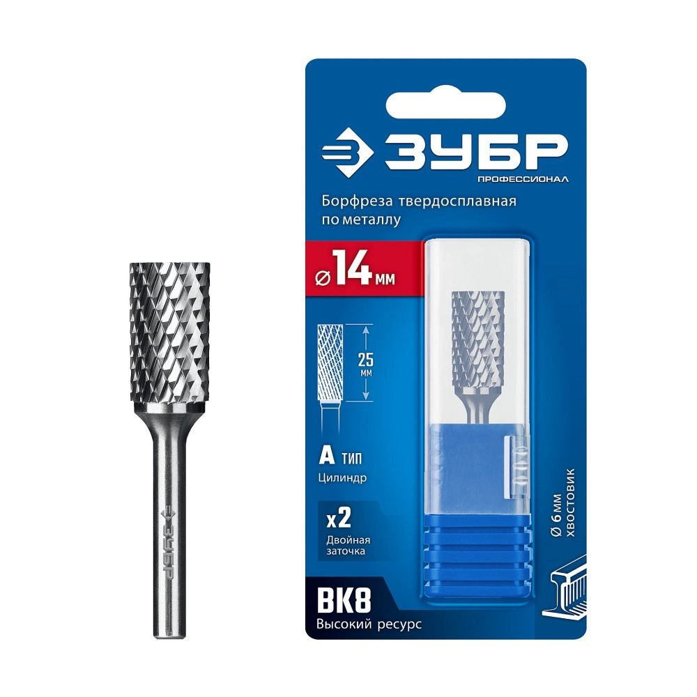 ПроизводителиБорфреза цилиндр. с гладким торцом, 14х25х70 мм, тип А, хв-к 6 мм "ПРОФЕССИОНАЛ" (28800-14-25) ЗУБР