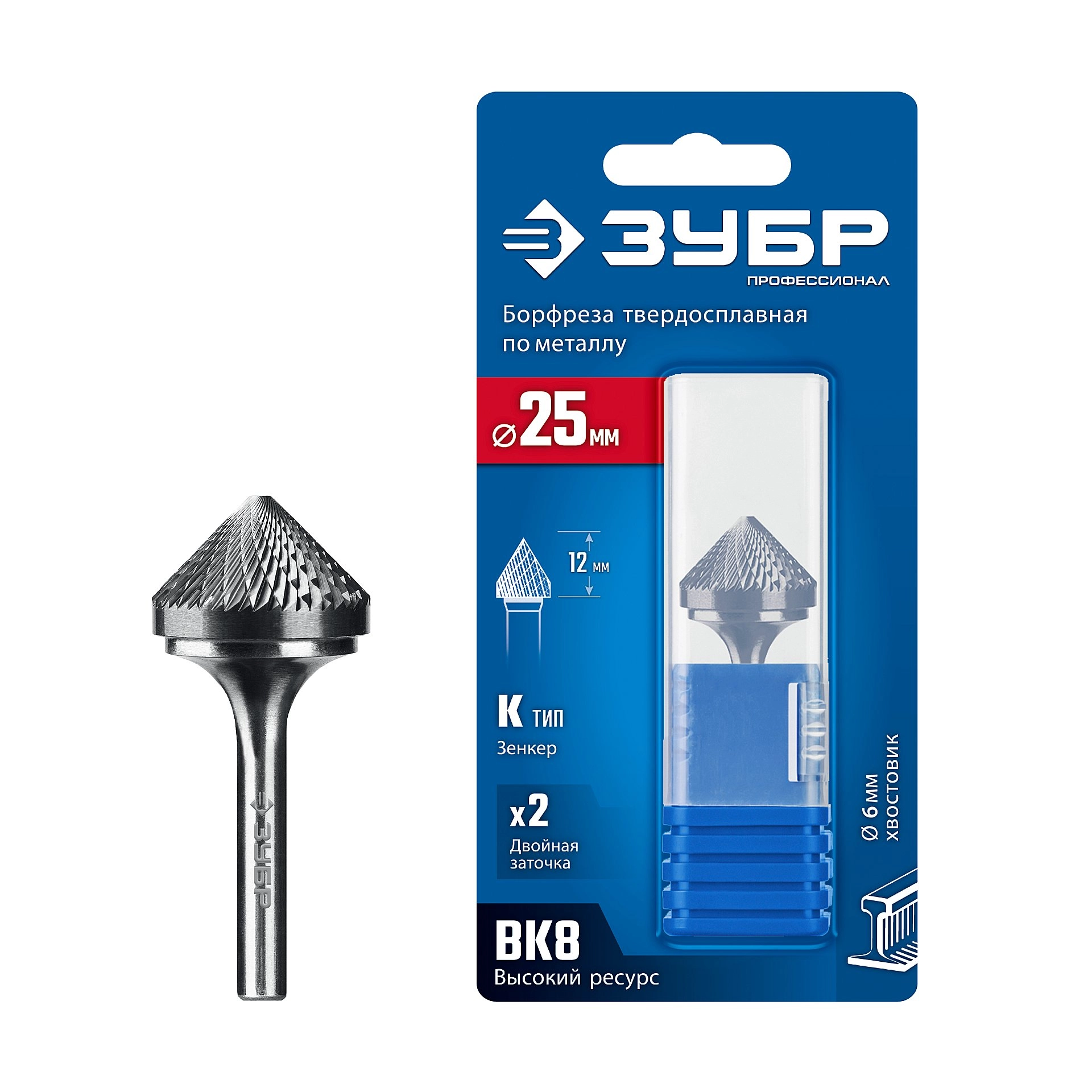 ПроизводителиБорфреза зенкерная 25х12х57 мм, тип K, с вершиной 90°, хв-к 6 мм "ПРОФЕССИОНАЛ" (28809-25-12) ЗУБР