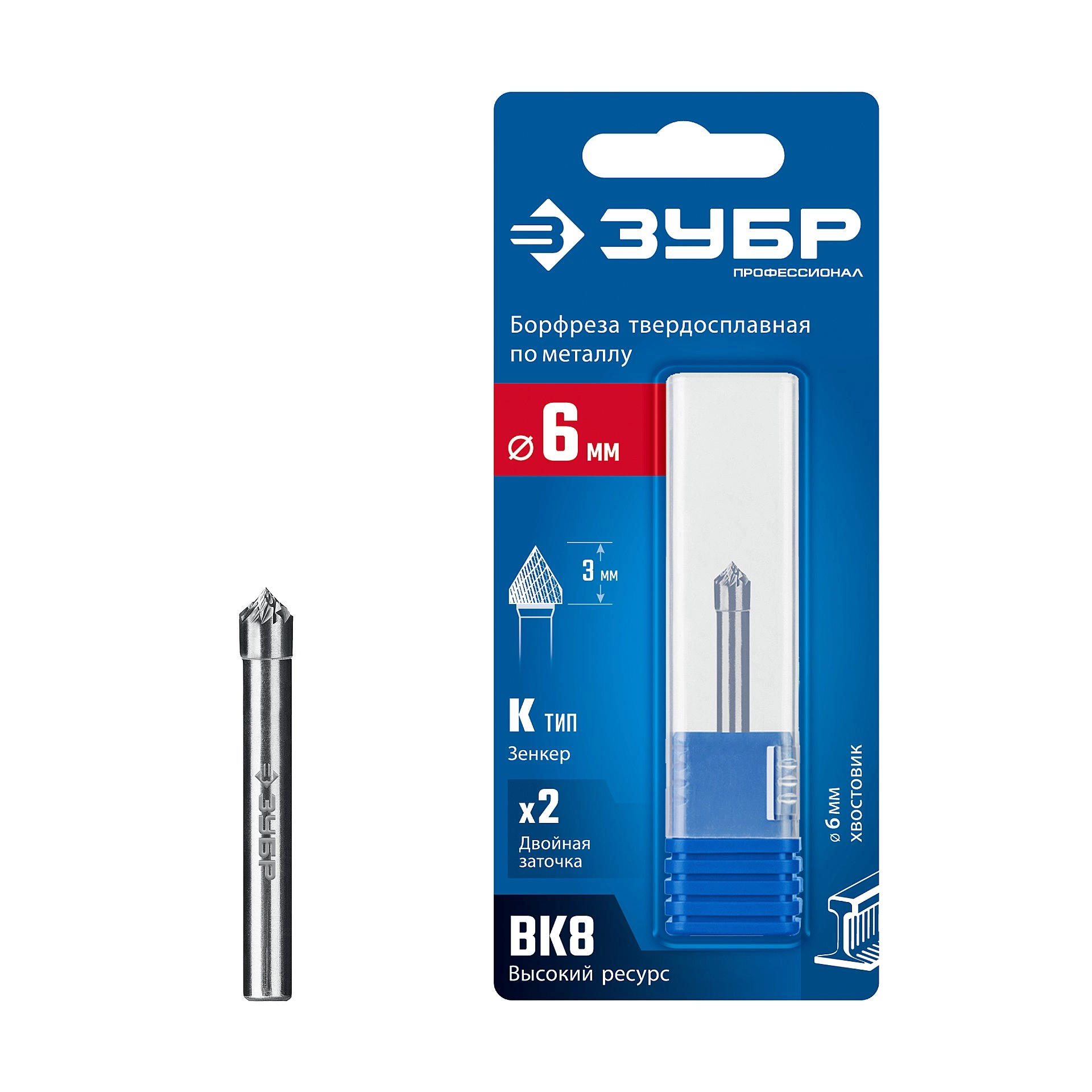 ПроизводителиБорфреза зенкерная 6х3х48 мм, тип K, с вершиной 90°, хв-к 6 мм "ПРОФЕССИОНАЛ" (28809-6-3) ЗУБР