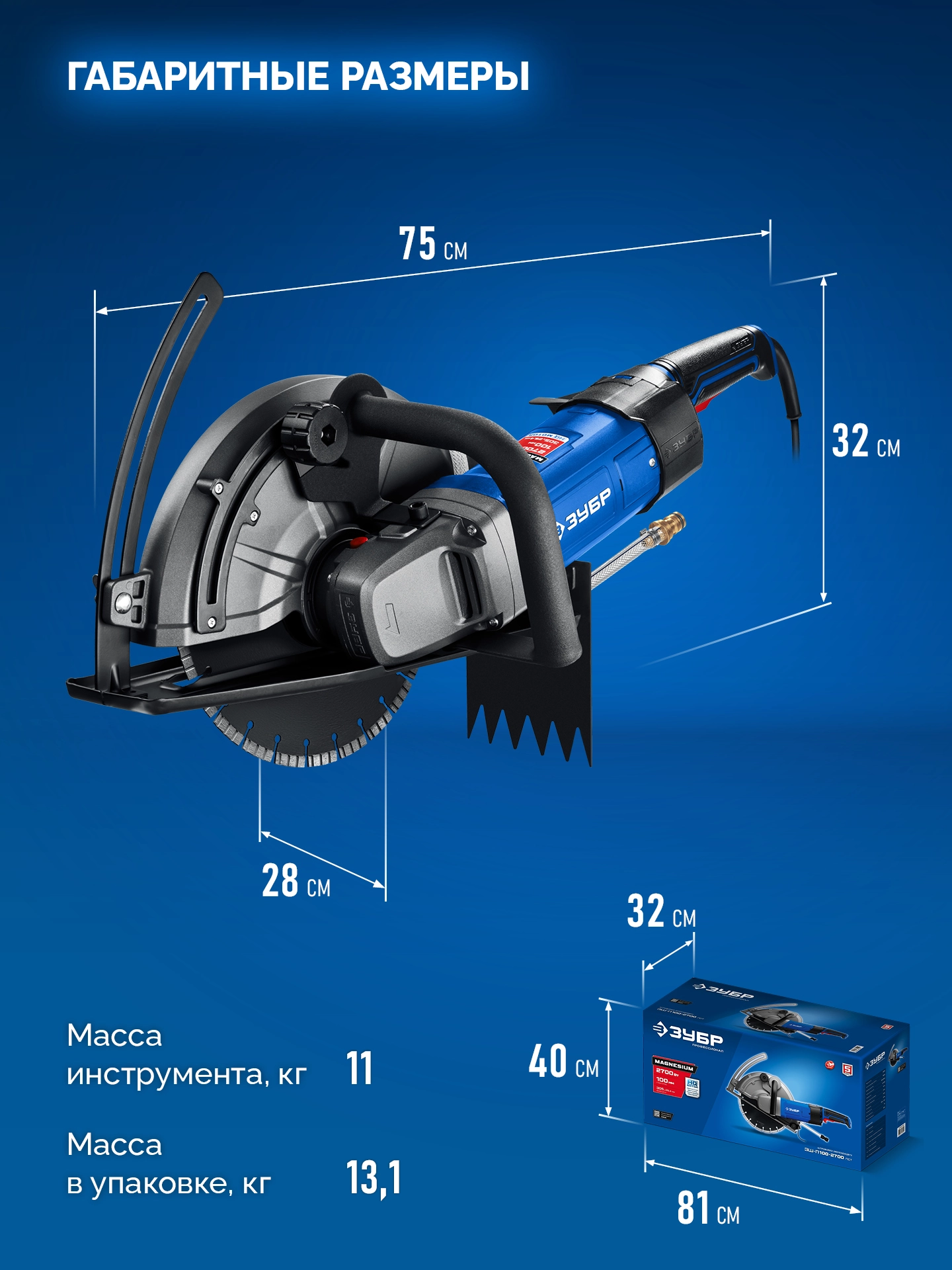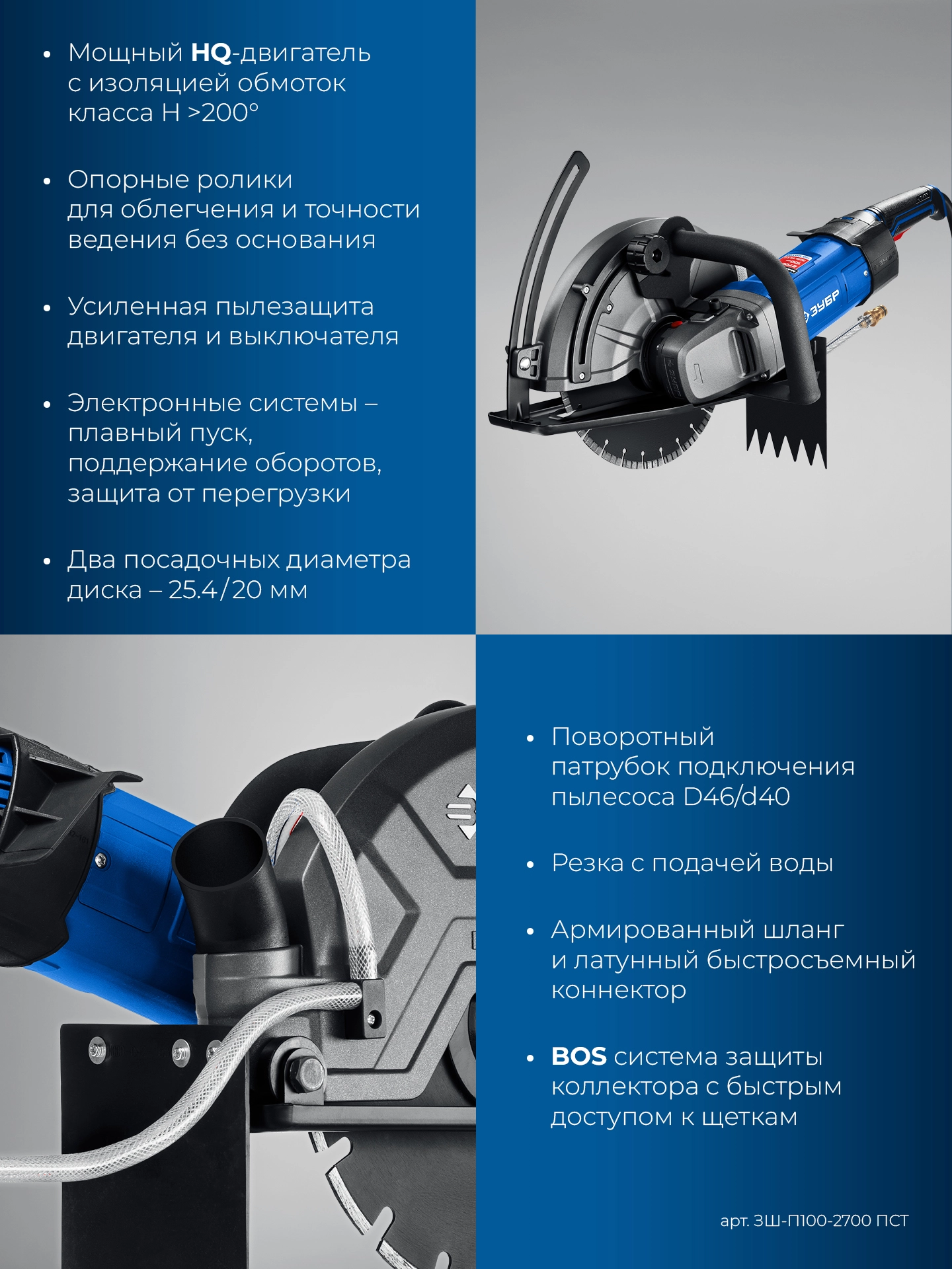 ПроизводителиБороздодел (штроборез) ЗШ-П100-2700 ПСТ (2700 Вт, макс. глуб. 100 мм, диск 305x25.4/20мм, кор.) ЗУБР