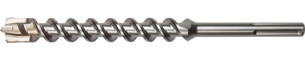 Головная рабочая часть в форме четырехгранного зубила быстро проникает в обрабатываемый материал и помогает избежать подклинивания бура при попадании в арматуру.