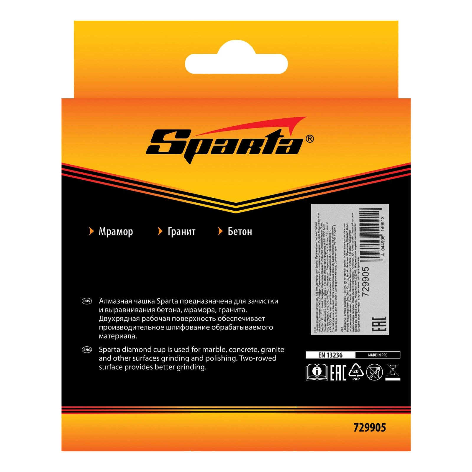ЭКОНОМУровень качества. При классификации продуктов, имеющих схожее наименование, но обладающие различными потребительскими свойствами мы приняли следующий Вес факторов: 80% - подтвержденный ресурс, 15% - заявленная производительность/скорость, 5% - субъективные ощущения потребителя. ПодробнееКод товара: 0051406(0)ХарактеристикиАртикул 729905Бренды SPARTAСтрана производства КитайОбрабатываемый материал бетонВид сечения 22.23Количество рядов 2Чашка алмазная "Двухрядная" ТМ SPARTA предназначена для шлифования камня, бетона, мрамора, гранита, кирпича, Данный тип чашки рекомендуется для черновой обработки поверхностей, снятия толстого слоя материала, Для бытового использования,Производитель: ООО "Мир инструмента", Россия