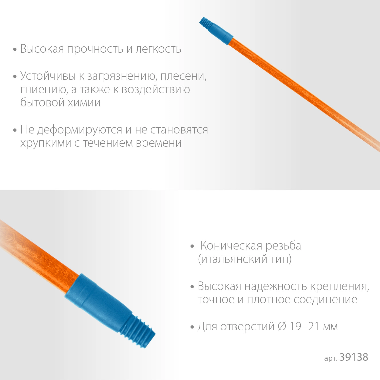 Черенок с чрезвычайно лёгким весом для для максимального комфорта в работе. Обладает высокой прочностью, очень долговечен. Используется в качестве ручки для щёток.