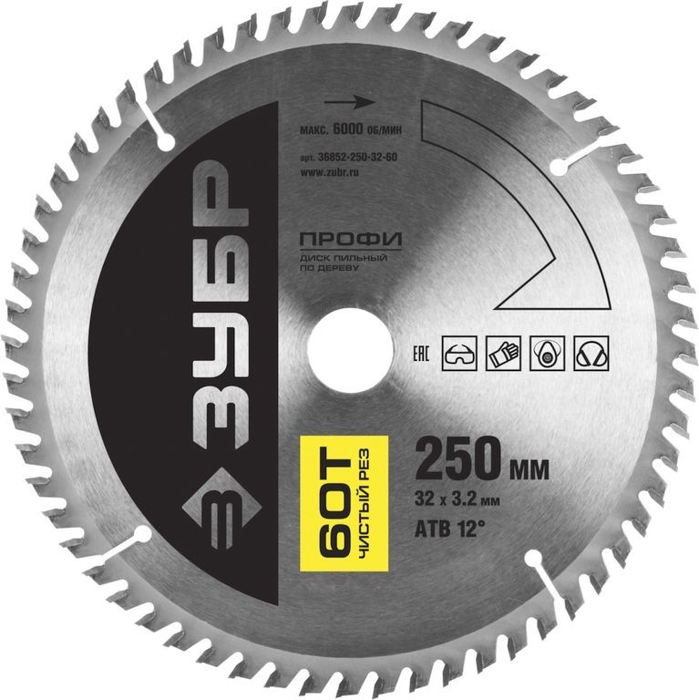 ПроизводителиДиск пильный 250х32х60 по дереву "Чистый рез" (36852-250-32-60) ЗУБР