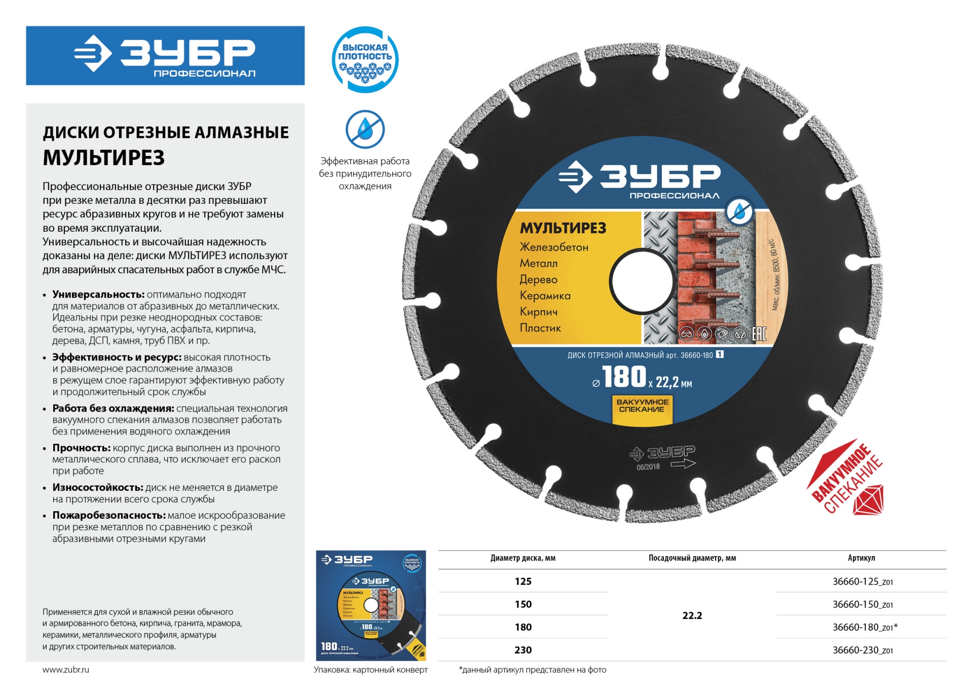 Исключительно высокий уровень качества отрезных алмазных дисков ЗУБР гарантирован комплексной системой контроля всего процесса производства: от качества поступающего сырья до готовой продукции. Корпуса алмазных дисков изготовлены из прочной легированной стали, способной выдержать значительную механическую нагрузку и высокую температуру.