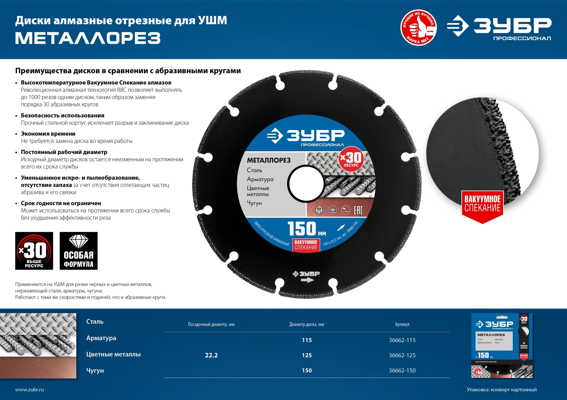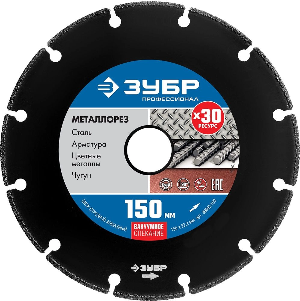 ПроизводителиДиск алмазный по металлу МЕТАЛЛОРЕЗ 150мм, вакуумное спекание,Профессионал (36662-150) ЗУБР