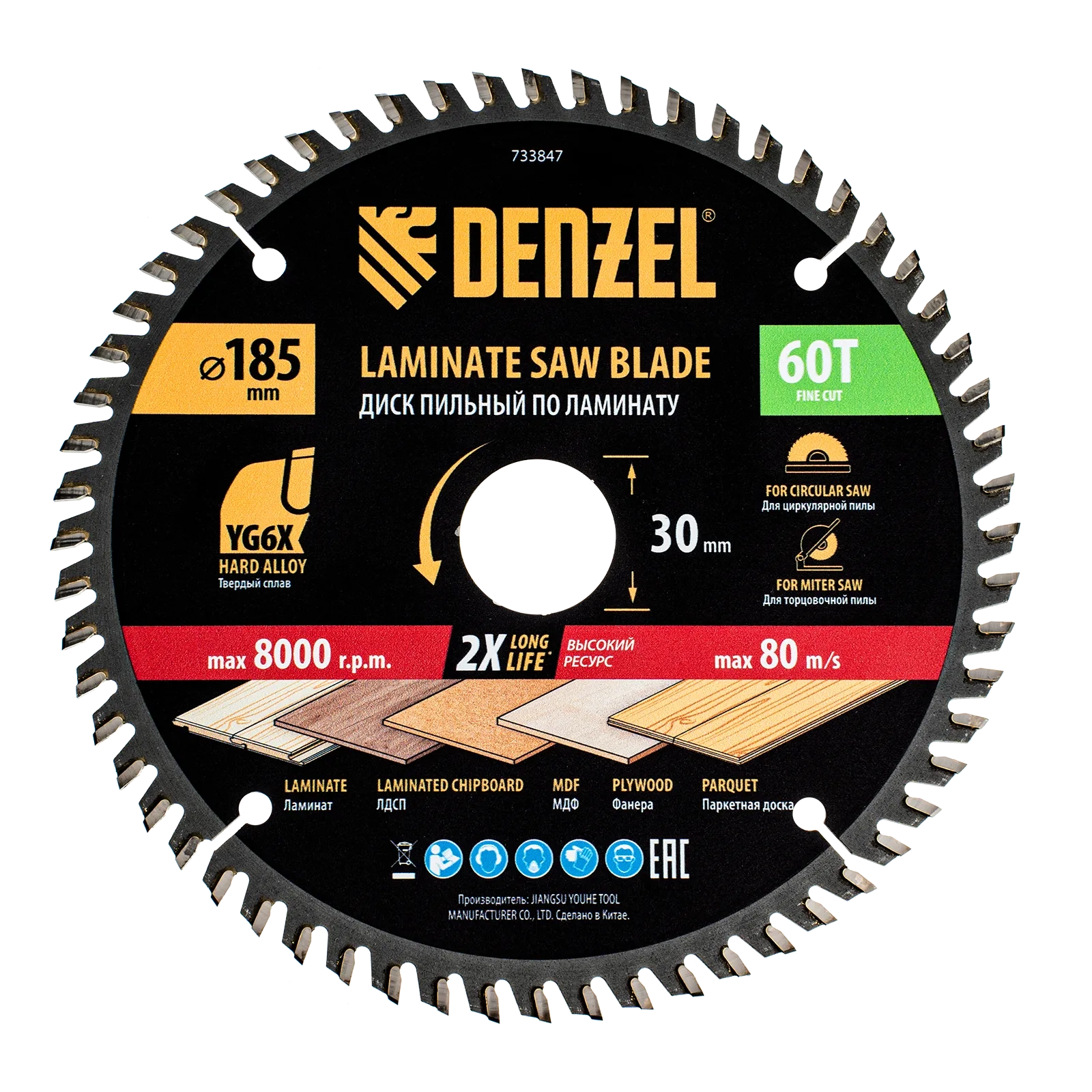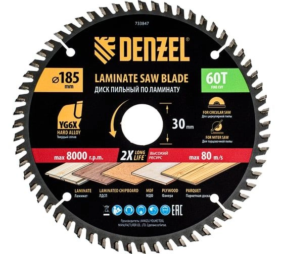 ПроизводителиДиск пильный 185х30х2.8х60T по ламинату (733847) DENZEL